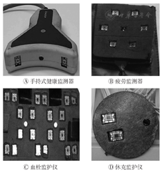 在使用OPT101进行NIRS仪器的探头设计时,需要根据被测感兴趣区(region of interest,ROI)形状、表面几何构型与数据处理算法,确定传感器的数量、光源与传感器的间距、光源和传感器的布置方式等。图2显示了几种使用OPT101的近红外监测探头,包括手持式健康监测器,血栓监护仪、休克监护仪和疲劳监测器。其中,手持式健康监测器用于测量腿部,上肢和乳房等部位,因此探头表面被设计成曲面;内部电路采用刚性电路板设计,硬封装,手持式外观;采用两个OPT101在光源两侧放置,用以实现相对双边比较测量;光源和传感器的间距为2.5 cm,该值是测量身体组织的最佳平均值(图2A)。用于血栓、疲劳和休克的监测探头被设计在柔性印刷电路板上;除传感器和光源部位,探头表面贴有黑色皮革,以使探头表面和监测表面紧密贴合,从而有效减少背景噪音和信号泄漏(图2B,图2C,图2D)。