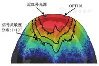 近红外监测仪器的探头设计中,光电传感器的信噪比是关键因素。通过使用体素化组织介质内蒙特卡罗光传播模型[34]和中国可视化人体(Chinese visible human,CVH)头部模型,计算出头部信号的灵敏度分布(signal sensitivity distribution,SSD)图,以分析信噪比对探头设计的影响(图3)。因为,人体头部具有最复杂的组织结构[35,36,37]。如图3,当信噪比超过OPT101传感器的探测极限时(1×10-7),近红外光源和传感器的间隔允许的组织检测深度大于3 cm;而深度超过3 cm的组织区域的累积光信号高于入射光的1.27×10-6。SSD的数据表明,OPT101可实现组织光信号的灵敏、可靠检测。