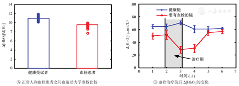 采用便携式血栓诊断NIRS仪器对正常受试者和血栓患者的血液动力学参数进行了比较(图7)。结果显示,正常受试者的Δ[HbO2]/Δ[Hb]值范围为11.0±0.95,而血栓患者的Δ[HbO2]/Δ[Hb]值范围为9.6±1.10。Studentt检验结果显示,两者差异存在统计学意义(P<0.001)(图7A)。如图7B所示,在患者治疗期间,其患有血栓的腿Δ[HbO2]值不断下降,而Δ[HbO2]在治疗结束后的恢复期逐渐升高,并在治疗后2 d达到最高值;而未患血栓的腿Δ[HbO2]值在治疗1 d内恢复到初始状态,并在治疗后保持稳定。结果表明,使用便携式NIRS血栓监护仪可以监测血液动力学变化,并根据液动力学参数Δ[HbO2]/Δ[Hb]或更灵敏的Δ[HbO2]确定血栓区域,可从人体健康区域辨识出血栓区域,并评估治疗效果。