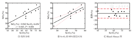 ScvO2是预测休克严重程度的金标准,因此在实验期间通过常规血滴采样和血液-气体分析对患者ScvO2数据进行了采集。将ScvO2数据作为对照,对便携式空间分辨NIRS休克监护仪的可靠性和灵敏度进行分析。结果表明,休克监护仪监测到的StO2数据与ScvO2数据之间存在明显的相关性(R=0.843,P<0.001)(图8)。如图8B所示,总共12个数据中,只有3个数据点落在ScvO2的95%置信区间外;但这3个数据点与95%置信区间非常接近。Bland-Altman图表明,StO2和ScvO2之间存在相当好的一致性(平均差为4.16%)。以上结果表明,在ScvO2测试的原位监测的StO2数据具有代替当前金标准参数(ScvO2)的潜力。