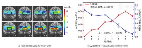 疲劳评估结果显示,随着游戏时间的延长,受试者前额血液动力学参数(Δ[HbO2])和行为表现因子(操作准确度/RT)呈非线性变化(图9)。前额激活伪彩图显示,受试者的前额叶是逐渐被激活的,尤其是前额的中下部(黑框部位,图9A)。此外,对受试者前额Δ[HbO2]和行为表现因子进行了统计学分析并绘制了其随时间变化的曲线(图9B)。结果表明,疲劳会导致Δ[HbO2]升高并导致行为表现降低,两者的变化趋势是相反的,Δ[HbO2]和行为表现因子的统计平均值显示出显著的负相关性(R=-0.896,P=0.002)。