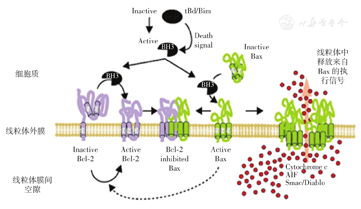 1993年,有研究者首先在白细胞介素-3(IL-3)依赖细胞凋亡途径中发现了Bax基因表达的蛋白。Bax是Bcl-2家族中的一员,该家族蛋白表达具有高度同源性。Bax是最早发现的促凋亡因子,有21%的氨基酸与Bcl-2同源[3]。Bax基因定位于染色体19q13.3~19q13.4,有6个外显子。按mRNA剪接方式的不同,Bax-mRNA分为α、β、δ、γ、σ、ξ 6种亚型[4]。通常Bax蛋白即指Bax-α,由192个氨基酸残基组成,相对分子质量为21 ku[5]。其含有BH1、BH2和BH3结构域,不含Bcl-2家族中的BH4结构域。Bax蛋白在细胞内膜、细胞浆和细胞核等处均有分布,只有收到信号刺激才从胞浆中转移至线粒体膜[1]。Bcl-2一般存在于线粒体外膜上,主要负责定位和插入线粒体外膜,抑制细胞凋亡,其表达可对抗细胞内外的自由基引起的氧化损伤。Bcl-2可竞争性地结合Bax蛋白,当Bax同Bcl-2形成异源二聚体时,Bax同源二聚体的形成减少,拮抗性抑制凋亡发生[6]。当Bax和Bcl-2处于动态平衡时,细胞正常存活。因此,有研究者将Bax和Bcl-2的比值称为"凋亡开关"。虽然其蛋白相互作用已被研究,但具体关于Bax如何迁移到线粒体位置及其相关磷酸化还不是特别明确。有研究结果表明,Bax在迁移中与Bcl-xL分子相互作用,Bcl-xL确实能重新定位Bax从线粒体到胞质并起作用[7],但相应的Bcl-xL△C缺乏此能力[8,9]及刺激Bax活化能力[10]。