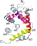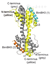 Bax的C端疏水区是假定的跨膜域,C端一部分结构形成α9螺旋。Bax中的α9螺旋定位在疏水口袋结构,尽管多肽定位方向与Bax的C端螺旋方向相反,但其方式与Bak BH3多肽结合到Bcl-xL上类似。删除Bcl-xL的C端24个残基,减少这部分的结构后蛋白疏水口袋结构暴露。改变Bcl-xL的α2、α3、α4螺旋可以解释部分蛋白疏水口袋结构暴露减少的情况。缩短Bak多肽或缺少部分结构无法阻止α2、α3、α4螺旋在包装中靠近中心区。在Bax中,长链C端螺旋定义这些螺旋线方向和包装情况。Bcl-xL这些疏水口袋结合Bak多肽上BH3结构域,已表明该位点在抗凋亡性Bcl-xL和相对应的促凋亡BH3结构域之间可形成二聚体[2]。