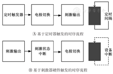 为保证硬件的兼容性,通过分层设计将软件逻辑和硬件操作分离。所有的软件逻辑位于主程序中,对硬件设备的请求交由委托层完成,使软件逻辑和硬件设备解耦合,增强了刺激软件的通用性(图1)。刺激软件运行于.NET Framework 4.0平台。根据设备驱动程序性质的不同,部分硬件设备请求可通过运行在.NET Framework 2.0平台的代理程序(委托层)委托提交,而少数硬件操作(如电极切换)必须直接递交至驱动程序,即通过.NET互操作性(.NET Interop)的方式完成。刺激软件的核心工作流是刺激器和电极切换状态的协调,有2种备选时序流程方案,分别基于定时器触发和刺激器硬件触发。