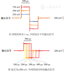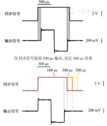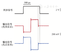 本刺激软件中,同步输出信号可用于门控刺激信号。当同步信号为逻辑真时,刺激电压才能被加载到所选择的刺激电极上。为减小刺激伪迹,可提前给定同步信号,以便让信号记录设备有充足的时间进行电极切换(如:可提前100 μs给定同步信号,也可在刺激信号结束后100 μs再停止输出同步信号),使电极有充分的时间放电,以减小基线漂移。测试时,将刺激信号设置为±500 mV、持续时间为1 ms的PN脉冲方波,输出同步信号(逻辑真、电压5 V)早于刺激信号100 μs输出,延迟100 μs结束。结果显示,刺激信号和同步信号的输出符合预期。进一步取消同步信号的提前输出,并将同步信号时延分别设置为100、300和500 μs。结果显示,刺激软件仍可正确输出同步信号。(图4)