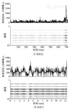 为了验证多通道电生理研究功能,开展了刺激器与电极阵列联合验证实验。选取培养时间为6周的皮质神经元样本,使用本刺激软件进行随机电极刺激,对培养皿各通道输出3轮±500 mV的PN波,刺激波形时长2×400 μs,刺激间隔1 s,检查该样本对应的各个通道中是否存在缺陷电极或不良的细胞接触。随后,开展持续5分钟的多电极切换随机刺激(±500 mV,刺激波形为PN波,刺激波形时长2×400 μs,刺激间隔1 s),比较随机刺激对放电活动(spikes per second array-wide,SPSA)的影响。结果显示,在全皿多个通道上施加随机刺激,不仅能够有效诱导网络增强放电活动[12],而且出现了网络振荡现象[20,21],提示本刺激软件能够实现设计目标并满足研究需求。(图7)
