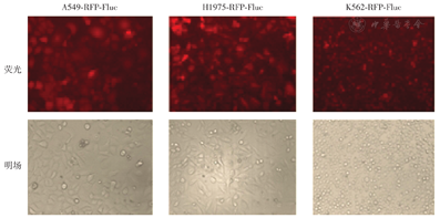 获得的RFP和Fluc双表达人肺癌细胞系A549、H1975和人B细胞淋巴瘤细胞系K562,为人肺癌细胞免疫缺陷小鼠模型的活体成像提供了新荧光配色细胞模型。