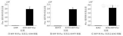 成功构建了pHBLV-Fluc-RFP慢病毒载体,获得了稳定表达Fluc和RFP的A549、H1975和K562细胞。荧光显微镜下可观测到3种稳定感染细胞中均有红色荧光。实时定量PCR检测结果显示,3种稳定感染细胞中Fluc基因的相对表达量远远高于对应的野生型细胞,差异均具有统计学意义(均P<0.05)。