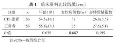 CTS组与对照组的临床资料比较结果显示,其在年龄、女性病例数和身体质量指数上的差异无统计学意义(均P>0.05)。(表1)