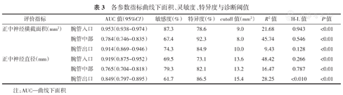 通过ROC计算得出不同组别、部位、指标的AUC、敏感度、特异度以及诊断阈值等,如表3所示。结果表明,各项测量指标中,腕管入口处的正中神经横截面积具有更好的ROC曲线AUC,其CTS诊断意义最佳,且灵敏度与特异性均较好。(表3)