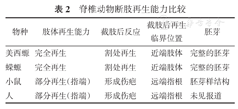 | 物种 | 肢体再生能力 | 截肢后反应 | 截肢后再生临界位置 | 胚芽 |