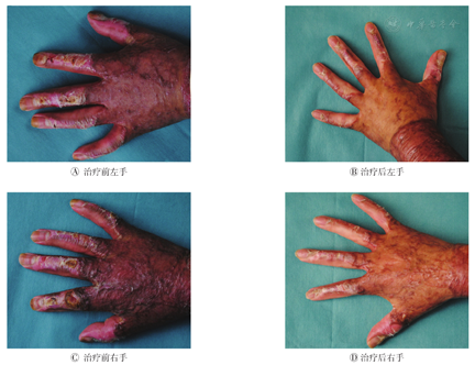 治疗结束后6个月,35例患者对瘢痕色泽、体积、硬度、痛痒及功能改善等方面疗效感到非常满意,10例患者表示满意。其中,有效果显著病例为1例男性患者,31岁,双手背及指背近节深度烧伤,植皮术后感染,皮片散在坏死,创面完全愈合后,瘢痕增生2月余,患者要求改善双手背及指蹼瘢痕硬度及瘙痒情况;治疗前,其左、右手VSS评分分别为9与13,瘙痒VAS分别为3和4。治疗过程包括清洁瘢痕区域并给予表面麻醉;超脉冲模式的照射参数为:能量150 mJ、频率40 Hz、孔间距4 mm,每孔治疗时间2 s;Scaar FX模式的照射参数为:能量90~120 mJ,频率250 Hz,密度3%;共治疗4次。6个月后随访时,其左、右手VSS评分分别为4和6,瘙痒VAS评分均为1;瘢痕色泽改善明显,质地变软,整体感觉柔软程度改善,治疗过程中未发生不良反应,患者对疗效非常满意。(图1)