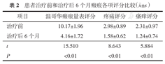 患者治疗后6个月的VSS评分为4.16±1.72、疼痛评分1.58±0.62、瘙痒评分1.24±0.74,而治疗前的各项评分分别为10.17±1.96、2.98±0.89、2.31±0.97,其差异有统计学意义(均P<0.01)。(表2)