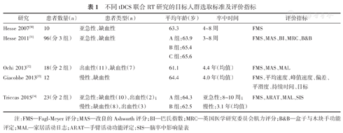 tDCS联合RT产生的效果研究是一个相对新的领域,相关研究较少。对于目标人群的选取,不同研究的选取标准存在差异(表1)。Hesse等[30,31]开展的2项研究均选取亚急性与缺血性的脑卒中患者,包括皮层和皮层下病变患者。Ochi等[32]的研究主要针对慢性的,中度至重度的脑卒中患者,包括出血性与缺血性患者。此外,Giacobbe等[33]的研究也是针对的慢性与缺血性脑卒中患者。而Triccas等[34]开展的实验研究中,目标人群包括了亚急性和慢性患者,且既包含出血性又包含缺血性卒中。因此,tDCS联合RT针对的目标人群广泛,对不同受损部位、病程与严重程度患者均有意义与价值。