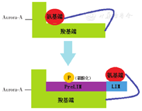 在乳腺癌细胞系中可检测到Ajuba的表达,发现Ajuba虽然在每个细胞周期的表达水平基本恒定,但在肿瘤细胞的有丝分裂过程中被磷酸化,从而促进了细胞增殖[20]。研究结果显示,在有丝分裂过程中Ajuba的磷酸化与Aurora-A有关。在细胞周期的G2期,激活的Aurora-A招募CDK1-cyclin B复合物至中心体,促进细胞进入有丝分裂期[21,22,23]。在进入有丝分裂期时,Ajuba被Aurora-A磷酸化,然后增强Aurora-A的活性。Ajuba是Aurora-A活化所必需的。若没有Ajuba,Aurora-A的氨基端和羧基端相互结合,抑制了其自身激酶的活性,阻止或延缓Hela细胞从G2期进入有丝分裂期,而加入Ajuba-LIM就会消除这种影响。Ajuba的LIM结构域通过竞争性结合Aurora-A的氨基端(aa 1~128, Nt),抑制了Aurora-A氨基端和羧基端的相互作用,于是Aurora-A羧基端恢复了被氨基端抑制的自我磷酸化,同时Aurora-A的催化区域(aa 129~403, Cd)能够磷酸化Ajuba的PreLIM区域[21]。(图1)