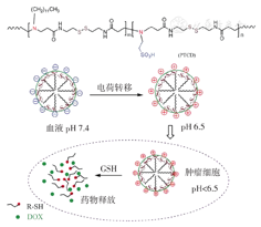 聚合物囊泡通常是由两亲性的嵌段共聚物组成,两亲性高分子聚合物可在水相中以自组装的形式形成相应的囊泡结构。常见外观为球体,尺寸范围从几十纳米到数十微米[15]。同时,聚合物囊泡具有类似于细胞膜的双分子层结构,存在空间较大的亲水性内腔,可同时包载具有亲水性和疏水性的抗肿瘤药物。使得一个载药系统里包载不同的抗肿瘤药物,协同发挥作用。囊泡亲水性的外壳结构使得自身具有较好的稳定性,以减少在血液循环过程中药物的过早释放,让更多的药物到达患处,从而可更大程度地提高治疗效果。Laskar等[16]设计合成了一种无规聚合物聚(2-甲基丙烯酸羟乙酯-3,3-二硫代二丙酸)-聚(乙二醇甲基丙烯酸酯),通过荧光光谱、光散射、电子和光学显微镜研究了聚合物自组装的行为。研究结果发现,在pH 7的环境下,聚合物可在水相中自组装形成表面带有负电荷的聚合物囊泡;并且即使在高浓度的条件下,也具有良好的生物相容性,能较好地保护所装载的人的血清白蛋白,在载药方面拥有良好的应用前景。除无规共聚物外,嵌段共聚物形成的囊泡的研究也有报道,如Wu等[17]以氨基乙磺酸、N,N-二(丙烯酰)胱胺、十二烷胺为原料,通过Michael加成反应合成了一种三嵌段聚合物,该聚合物在水相中可自组装形成两性离子的纳米囊泡结构,该纳米粒在pH 7.4的条件下,表面带有负电荷,在pH 6.5的条件下,表面电荷反转为正电荷(图1)。使得纳米粒可以更好地在血液系统中长循环和被肿瘤细胞吸收。在谷胱甘肽的刺激下,可使主链中二硫键断裂来实现聚合物的降解,该材料显示了优越的pH/还原双敏感性的性质。超支化聚合物与线型聚合物相比拥有三维立体结构,具有强化学反应性、高的溶解性等特点。在作为药物载体的方向上也有研究。Nie等[18]利用对酸敏感的顺式乌头酸将阿霉素连接到聚乙二醇化的超支化酰胺分子上,在四氢呋喃中会自组装形成聚合物胶束,用二硫键交联后并转移到水相中形成聚合物囊泡。在中性环境中阿霉素释放的较少。体外研究表明,聚合物囊泡在酸性和还原性环境下会实现阿霉素的快速释放。体内研究结果表明聚合物囊泡具有较低的组织毒性和良好的抗肿瘤效果。Teranishi等[19]合成了一种树枝状聚酰胺-聚L-赖氨酸聚合物,并在聚L-赖氨酸之间引入二硫键,该聚合物同时具备了pH和还原敏感性。聚L-赖氨酸膜层对阿霉素具有静电屏蔽作用,可有效防止阿霉素在细胞外环境中释放。囊泡进入到细胞内后通过谷胱甘肽的刺激从而实现阿霉素的释放。囊泡作为药物载体的研究很常见,囊泡具有的特殊结构备受研究者的青睐。可同时包载不同的药物协同发挥作用,这与"鸡尾酒疗法"的治疗恶性肿瘤的思路一致。聚合物囊泡会因其特殊的性质将在未来发挥更大的作用。