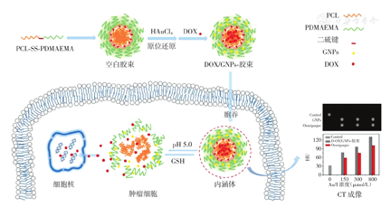 聚合物胶束是由两亲性聚合物通过范德华力、氢键、静电作用而形成的一种体系。内部是疏水结构,可包载疏水的抗肿瘤药物,外部是亲水结构可使胶束稳定存在。胶束尺寸范围通常在10~100 nm之间,分布范围很窄[20],是一种很常见的纳米药物载体。形成胶束的聚合物一般是嵌段聚合物,包括人工合成的可降解高分子材料和天然的高分子材料。形成的胶束形状也多种多样,如球状胶束、棒状胶束、层状胶束等。人工合成的高分子材料虽然制备方法较为复杂,来源也不如天然高分子丰富,但人工合成的高分子材料有着更为出色的性质,通过引入特定的基团就可获得预想的性质。人工合成的高分子作为药物载体一直是研究的热点。Xiong等[21]利用聚己内酯和聚(2-(二甲胺基)甲基丙烯酸乙酯)通过二硫键将两种链段连接起来,形成一种两亲性嵌段共聚物。聚(2-(二甲胺基)甲基丙烯酸乙酯)在酸性条件下会发生质子化反应,亲水性增强,胶束发生膨胀。进入到细胞后在谷胱甘肽的刺激下,二硫键发生断裂,胶束发生解体(图2)。在包载阿霉素后,可有效控制药物的释放。Tan等[22]采用聚丙烯酸、胱胺、十八烯酸为原料合成了一种两亲性嵌段共聚物,用于包载治疗肺癌的药物埃罗替尼。其中聚丙烯酸是一种酸敏性材料,具有良好的生物相容性。胱胺含有二硫键,还原响应性原理与前者相同,所形成的胶束粒径约为170 nm,zeta电位是-32 mV。包封率和载药率分别为85%、2.6%。通过体内和体外实验观察,与埃罗替尼的原液相比,载埃罗替尼聚合物胶束显示出更好的肿瘤治疗效果,是一种很有应用前景的肺癌治疗药物的输送体系。除上述人工合成的高分子材料,天然高分子材料作为药物载体也受到了广泛的关注。天然高分子是指自然存在的一类材料,通常含量丰富,易于获得;同时大部分都具有良好的生物相容性和生物可降解性,不会对人体产生明显的毒副作用。因此利用天然高分子进行胶束的制备也常见报道,是一个热门的研究领域。Yang等[23]合成了一种同时对pH和还原环境敏感的多聚糖,并用二硫键进行交联,利用疏水作用和静电作用来包载盐酸阿霉素,用二硫键进行交联不仅使胶束对还原环境进行响应,还能起到稳定胶束的作用。利用流式细胞仪和激光扫描共聚焦显微镜进行表征,可发现包载盐酸阿霉素的胶束与游离的盐酸阿霉素相比,具有更好的杀伤肿瘤效果。利用葡萄糖合成相应的聚合物也有类似研究。Wang等[24]利用N-乙酰氨基葡萄糖合成了一种两亲性嵌段聚合物,该聚合物形成胶束后通过胱胺作为交联剂进行交联可以调节药物释放的速度。交联之后,胶束的性能得到进一步提升。与非交联的胶束相比,胶束外观呈球形,平均粒径略显增大(102.40±0.54)nm,有着更低的分散度(0.36±0.19)。在zeta电位方面,交联后,从(-41.46±0.99)mV增加到(-9.31±0.50)mV。体外释放研究结果表明,载药胶束没有出现药物突释现象;相关细胞实验研究结果表明,交联后的载药胶束可更好地通过内吞作用被摄取到细胞内,而发挥抑瘤作用。两性纳米粒子在血清中有着很好的稳定性,因此在药物载体方面的研究也很广泛。Wu等[25]通过琥珀酸对葡聚糖进行修饰,可同时对pH和还原环境进行响应。胶束表面的氨基与羧基可有效地避免被蛋白质的吸附。同时纳米粒表面电荷会在不同的pH值下发生转换。在pH 7.4条件下,表面电荷为负,在pH 5条件下,表面电荷转化为正。载入阿霉素后,可在血清中稳定存在,受到特定的刺激后释放,是一种具有良好的生物相容性、生物可降解性的药物载体。虽然胶束不能像囊泡一样同时包载亲水和疏水的药物,但胶束具有很高的热稳定性与动力学稳定性。