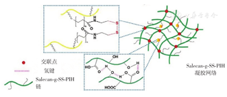 水凝胶是一种高度交联的高分子网络体系,具有三维立体结构。以水为分散介质,引入亲水与疏水基团,使得亲水基团与水分子结合,水分子进入到水凝胶内部,水凝胶发生吸水膨胀。水凝胶的溶胀与收缩通常具有可逆性。水凝胶具有优异的溶胀性、较高的载药量、可降解性、良好的凝胶能力以及生物相容性[26]。同时水凝胶具有较低的黏附力,可有效地减少蛋白质和细胞的黏附,从而减少机体免疫反应的发生,且凝胶合成简便。正是由于这些优越的性质,水凝胶在很多方面尤其是生物医学领域都有着广泛的应用[27,28,29,30,31],在药物载体的研究方面也在快速的发展。水凝胶有着较强的刺激响应性,因此吸引了很多科研工作者对刺激响应性水凝胶载药系统的兴趣。Curcio等[32]以丙烯酸甲酯右旋糖酐、2-氨基乙基丙烯酸甲酯、N,N-二(丙烯酰)胱胺为原料,用沉淀聚合的方法合成了一种纳米凝胶用于包载甲氨蝶呤,形成外观成球状的凝胶,其粒径在460 nm左右,PDI小于0.3。在pH 5、10 mmol/L谷胱甘肽的条件下,凝胶发生溶胀。体外释放研究结果表明,在pH 5、10 mmol/L谷胱甘肽的条件下,药物的累计释放率是pH 7.4,不含谷胱甘肽环境下的5倍。并通过流式细胞仪和共聚焦显微镜观察发现,该纳米凝胶具有很好的pH敏感性。该纳米凝胶具有良好的pH和还原敏感响应性,是一种很有前景的载药系统。索拉胶是一种水溶性的β-葡萄糖,具有良好的生物活性、低毒性以及良好的可降解性,可用于人体,在生物医学方面有非常广泛的应用。Hu等[33]利用接枝聚合的方法对索拉胶进行修饰,通过引入二硫键和羧基使得制成的水凝胶同时具有pH和还原敏感性,用来包载阿霉素并控制其释放(图3)。可通过改变pH和索拉胶的含量来调控水凝胶的溶胀行为,使得材料具有很大的调控空间。利用水凝胶的溶胀收缩机制使得药物释放速度得到调控。同时制备原料易得,未来有望应用于临床作为药物载体。血清白蛋白是含量比较丰富的一种蛋白质,常存在于脊椎动物的血浆中。Raja等[34]创造性地将血清白蛋白转化为一种同时对pH和还原敏感性的凝胶。研究结果表明,在pH 9条件下,水凝胶溶胀达到最大程度。随着白蛋白浓度的增加,形成的水凝胶的稳定性、生物降解率、流变性能、抗压程度都会随之提高。通过进一步的实验研究研究结果表明,浓度为450 μmol/L的血清白蛋白的实验条件形成的水凝胶性能最佳。通过血清白蛋白转化为凝胶用于载药的方法十分具有创造性,随着研究的深入,该凝胶载体会在生物医学领域发挥更多的作用。以氨基酸为原料合成的生物医学材料通常有着良好的生物相容性,所以相关研究也很常见。Gyarmati等[35]对聚(天冬氨酸)进行一定的修饰得到一种水凝胶,通过侧链上的二硫键的形成与断裂而使凝胶发生生成与溶解的可逆转化。转化过程在水和二甲基甲酰胺中均可发生。这种特殊性质使得这种水凝胶具有包载药物的潜力。在包载药物后注射到体内,受到pH变化和还原环境的刺激后,凝胶溶解,药物释放发挥作用。相比于前文提到的聚合物囊泡和胶束药物载体,水凝胶作为药物载体的研究还比较新颖,尤其是多刺激响应性水凝胶药物载体的研究更为少见;但水凝胶具有溶胀-收缩的可逆性质为药物的包载与释放提供了优越的条件。相信不久的将来,对于水凝胶的研究会更加深入。
