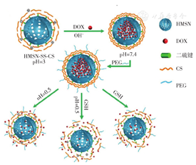 介孔硅是一种稳定的多孔性载体,可用于包载药物。介孔硅有着特殊的结构性质,如表面积大、孔隙体积高[36];同时介孔硅的粒径可通过反应条件进行调控而且粒径均一,从而引起科研工作者的广泛关注。介孔硅有着高的药物包载能力,使得局部甚至联合治疗成为可能[37];再加上介孔硅有着出色的稳定性和生物相容性,使得介孔硅在药物载体方面有着良好的前景。通过对介孔硅表面进行修饰,可以使介孔硅通过靶向作用到达患处,受到特定的刺激后释放药物。Lin等[38]利用透明质酸对介孔硅进行修饰,再将阿霉素接枝到硅球表面,很好地实现了药物在双重刺激下释放的目的。通过流式细胞仪和扫描电镜的分析发现,这种新颖的载药体系对于肿瘤细胞有着良好的杀伤作用。Jiao等[39]研究人员则选择的是常见的壳聚糖对介孔硅的表面球壳进行修饰,中间的部分由二硫键进行连接。其中壳聚糖带有正电荷有着良好的生物相容性。为进一步提高该药物载体在体内的稳定性,在壳聚糖的基础上进一步接枝聚乙二醇(图4)。研究结果发现,此载体的载药率高达32.8%。石墨烯是一种性能优异的新型碳材料,在生物医学方面也有很多应用,Wang等[40]利用介孔硅与石墨烯制成一种新型的纳米夹层载药材料。利用转移自由基聚合法将聚(N,N-二甲基氨基乙基甲基丙烯酸甲酯)接枝在这种复合材料上,中间由二硫键进行连接,使得这种材料具有pH和还原敏感性,是一种创新的纳米智能载药体系。介孔硅相对于前文介绍的药物载体有着更为优越的稳定性,虽然目前研究较少,但作为一种优秀的材料,必然会有广阔的应用前景。