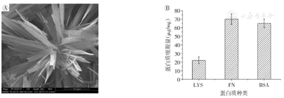 以二喹啉甲酸(bicinchoninic acid, BCA)法为例,染色法是利用蛋白质与染料结合形成复合物,定量测定微量蛋白质浓度的一种方法。在碱性条件下,二价铜离子被蛋白质还原成一价铜离子,一价铜离子和BCA分子螯合形成水溶性复合物,该复合物在562 nm处显示强烈的吸光性,吸光度和蛋白质浓度在较大范围内具有良好的线性关系,可根据吸光度值推算出蛋白质浓度,最小检测蛋白量可达0.5 μg。该法具有简单、快速、灵敏等特点,已成为最常用的蛋白质浓度定量检测手段之一。笔者曾使用BCA法系统研究了羟基磷灰石(hydroxyapatite, HA)颗粒表面的微纳结构[15]、Zeta电位[16]等因素对蛋白质吸附行为的影响,发现HA表面的微纳结构对蛋白质具有选择性吸附作用,带状HA(图1A)对酸性蛋白质如牛血清白蛋白(bovine serum albumin, BSA)、纤维粘连蛋白(fibronectin, FN)具有选择性吸附作用(图1B)[15]。该法定量精确,是研究生物矿化(骨骼、牙齿)中磷酸钙盐与蛋白质吸附行为的重要表征技术。