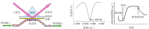 SPR是一种光学现象,可用于精确定量生物分子的相对分子质量。如图3所示,蛋白质分子结合在金表面,导致折射率发生改变,折射率改变的程度与结合蛋白质分子的相对分子质量成正比;而折射率的改变又导致入射光临界角(即SPR共振角)发生变化,通过测定SPR共振角可得到吸附于金表面的蛋白质的相对分子质量[22]。利用SPR检测蛋白质在材料表面的吸附量和吸附强度,有利于表征材料的蛋白质吸附性能。Chang等[23]利用聚环氧乙烷-聚氧化丙烯-聚环氧乙烷三嵌段聚合物对甲基为末端的自组装单分子层材料表面进行涂层处理,通过改变聚环氧乙烷/聚氧化丙烯的质量比和共聚物的相对分子质量获得了一系列不同性能的表面;SPR表征结果显示,当共聚物相对分子质量为15 000、聚环氧乙烷/聚氧化丙烯的质量比为4∶1时,对应的材料表面具有最强的抗蛋白质吸附能力。Liu等[24]在金表面制备聚N-乙烯吡咯烷酮,利用SPR技术表征纤维蛋白原在其表面的吸附量,发现聚N-乙烯吡咯烷酮具有较强的抗蛋白质吸附性能。同样,Luk等[25]利用SPR技术表征甘露糖醇单分子层的蛋白质吸附及细胞黏附性能,发现甘露糖醇修饰的表面具有较强的抗蛋白质吸附和抗细胞黏附性能。