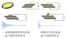 QCM-D可将蛋白质吸附质量和黏弹性信号转换为电路中的频率信号,是专门检测蛋白质等生物黏弹性物质的微天平(图4)。随着蛋白质分子在待测材料表面发生吸附,QCM-D将检测到质量的增加,精确度可达纳克级别,从而可实时检测蛋白质分子在待测材料表面的吸附质量。Lord等[26]利用QCM-D技术研究了聚甲基丙烯酸甲酯和几种以聚甲基丙烯酸-2-羟乙酯水凝胶为基底的材料对BSA的吸附行为,结果发现与以聚甲基丙烯酸-2-羟乙酯水凝胶为基底的亲水性材料相比,疏水性的聚甲基丙烯酸甲酯材料对BSA具有更强的吸附性能。Menz等[27]利用QCM-D技术研究了聚乙二醇改性表面和羟基改性表面的蛋白质吸附行为,发现聚乙二醇改性表面具有较强的抗蛋白质吸附性能。Li等[28]通过实时检测吸附质量的变化,得到了人血纤维蛋白原(fibrinogen,FIB)在金片表面随pH值变化的吸附曲线,发现FIB在酸性条件下的吸附速率明显快于碱性条件。
