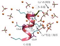 在蛋白质调控HA晶体成核、生长研究方面,Yang等[47]采用一段由10个氨基酸组成的肽链作为骨涎蛋白成核区域肽链的模型(图7),利用分子动态模拟技术模拟了模型肽链对溶液中Ca2+、PO43-空间分布的影响,以及不同构象的模型肽链对溶液中HA成核的影响。研究结果显示,各种构象的模型肽链均能起到成核作用,但不能形成具有稳定形状的HA微晶,研究认为骨涎蛋白成核模型能成核形成无定形态的磷酸钙团簇,后者最终转化为HA。