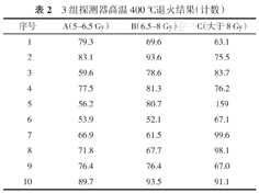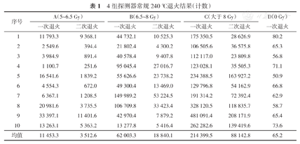 表2显示,对240 ℃没有退火完全的3组探测器经400 ℃高温退火10 min,退火结果满足系统测量要求,残余剂量被清除。此结果进一步说明经过大剂量照射后,热释光探测器的内部晶体结构发生变化,产生了240 ℃以上的高温热释光峰。但对于大剂量照射后的热释光探测器出现的高温峰具体介于哪种范围本次研究并未进行详细的探究,在今后的研究中研究者可尝试对大剂量照射后的热释光探测器利用不同高温条件进行退火来确定高温峰的区间范围。