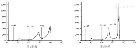 由于受脑部MR图像的强度不均匀性影响,直接使用OTSU多阈值分割结果不准确,因此使用BFC tool[7]去除强度不均匀性。图1A为图2B脑部图像对应的直方图,图1B为去除强度不均匀性后的直方图。可看出去除不均匀性后直方图的峰谷分布更为明显,更容易找到准确的最优阈值。图1的例子中,处理前的OTSU阈值为39、110和167,去除不均匀性后的OTSU阈值为35、101和153。