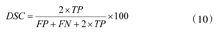 用S表示分割后目标区域像素点集合,T表示金标准目标区域像素点集合。式(10)中,TP为真阳性(true positive)数据集,TP=S∩T;FP为假阳性(false positive)数据集,FP=S-T;FN为假阴性(false negative)数据集,FN=T-S;DSC为评价结果,数值越接近100表示分割效果越好,DSC=100表示分割结果与金标准结果完全相同。
