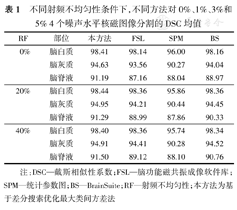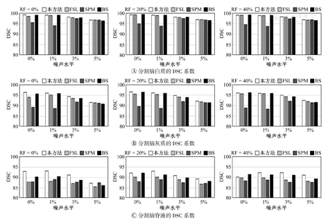 与FSL、SPM和Brainsuite方法比较,当噪声水平低、RF较强时,本方法所得DSC值最大,分割结果较准确;当噪声水平高、RF较弱时,噪声是影响分割结果的主要因素,而本文方法对噪声的健壮性更强,能获得更大的DSC值;当噪声和RF都很强时,所有方法的DSC值均下降,但本方法所得DSC值仍大于其他方法,分割效果也更好。