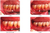 局部麻醉后,术区采用颊舌侧沟内切口,翻开黏骨膜瓣。超声波清除根面残余牙石;采用Gracey手动刮治器刮除骨缺损区域的炎症肉芽组织。高速球钻修整扶壁骨,在缺损区域植入相应的骨移植材料,并覆盖Bio-Gide胶原膜。用3-0不可吸收的强生尼龙缝线间断缝合。术后用西比氯胺含漱,每天2次,持续2周。术后2周后拆线,并观察伤口愈合情况。(图2)