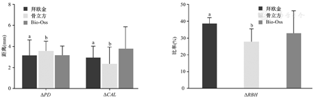 ΔPD—探诊深度改善;ΔCAL—临床附着失改善;ΔRBH—剩余骨高度改善。与骨立方组比较、与Bio-Oss组比较,aP>0.05;与拜欧金组比较、与Bio-Oss组比较,bP>0.05