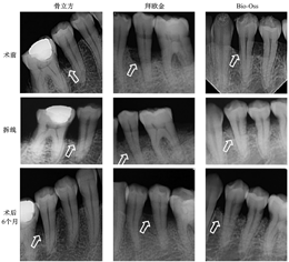 骨立方是我国自主研发的含Ⅰ型胶原与羟基磷灰石的人工合成骨,具有良好的生物相容性、安全性及骨再生效果。本研究中,骨立方联合GTR获得(2.3 ± 1.64)mm的临床附着增加(ΔCAL)。虽然,骨立方组术后拆线时根尖片检查显影欠佳,但随着新骨形成,显影问题逐渐得到改善(图4)。