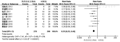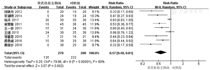 此项分析共纳入9个研究[3,4,5,7,8,9,10,11,12],各研究间存在异质性(I2=90%,P<0.000 01),故采用随机效应模型。结果显示,两组间差异有统计学意义[RR=0.57,95%CI(0.40,0.81),P=0.002]。(图3)