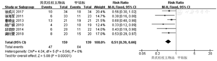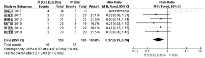 共纳入15个RCT,共849例患者。Meta分析结果表明:黄芪桂枝五物汤与空白对照组在OIPN总发生率[RR=0.57,95%CI(0.40,0.81),P=0.002]及严重OIPN发生率[RR=0.35,95%CI(0.25,0.48),P<0.000 01]方面差异有统计学意义(P<0.05),但在疾病控制率方面差异无统计学意义(P>0.05);黄芪桂枝五物汤与甲钴胺在OIPN总发生率[RR=0.51, 95%CI(0.39,0.66),P<0.000 01]及严重OIPN发生率[RR=0.37,95%CI(0.19,0.70),P=0.002]方面差异均有统计学意义(均P<0.05)。