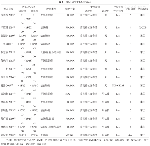 | 邹善思2015[3] | 21 | 21 | 胃肠道肿瘤 | FOLFOX | 黄芪桂枝五物汤 | 无 | Levi | 6 | ①② |