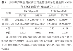 治疗前,两组患者血清MMP9和VEGF水平的差异无统计学意义(均P>0.05)。治疗后,两组患者血清MMP9水平明显低于治疗前(均P<0.05),联合给药组患者血清MMP9明显低于对照组(P<0.05)。治疗后,两组患者血清VEGF水平明显高于治疗前(均P<0.05);联合给药组患者血清VEGF水平高于对照组(P<0.05)。(表4)