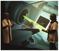 虚拟治疗室包括:完整的直线加速器、治疗床和多叶光栅(multi-leaf collimator,MLC);外部配备实际控制设备操作虚拟加速器,可用于后期交互式的操作训练;可提供直线加速器状态信息的显示屏;患者摆位使用的激光灯。虚拟设备中可显示患者皮肤表面以辅助摆位,2010年,Aarhus大学附属医院肿瘤科设立了直线加速器模型,主要用于临床相关的操作练习(图1)[10]。虚拟可视内容包括:患者在治疗床上的解剖结构,如肿瘤与危及器官(organ at risk, OAR)的3D结构、患者的影像数据(CT、MR、PET)及线束视观(beam eye view, BEV);浏览治疗射束及其组成部分;剂量分布的3D可视化,如等剂量线分布、肿瘤及OAR的剂量沉积。