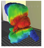 Perspecta系统将多个2D的横断面图像投影到以900 rpm旋转的扩散屏幕上,即生成直径25 cm的3D全息影像,由于视觉持久性及图像的全向扩散,3D图像像漂浮在61 cm圆顶内的空间中,且看起来是半透明的。为了进行数据传输,Perspecta系统还与治疗计划系统(如Pinnacle)间开发了软、硬件接口,诸如CT、OAR、参考点(Reference point)、剂量分布等就可在Perspecta系统显示。此外,Perspecta系统还包含3D鼠标(PHANTOM OmniTM, SensAble Technologies Inc., Woburn, MA, USA),通过机械臂在图像内移动光标,以定义射野等中心点(Isocenter)(图3)[22],之后使用3D鼠标可点击沿射野轴的任何点来定义射野方向,将以上内容同步至Pinnacle计划系统,利用定制软件(如RTStar)进行非共面放疗计划的自动碰撞检测,选取实际可执行的放疗计划。Perspecta系统还增加了一些计划工具,如3D工具尺,可用于射野形状的自动环绕、点剂量显示、指定光束与选择ROI相交部分的实时展示,因此更有利于检测PTV、OAR的受照剂量,促进全息图的治疗计划[23,24]。