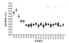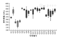导管拉伸实验结果表明,PU导管在常温时的弹性模量普遍高于FEP导管,如图3所示。在常温下,PU材料导管(G1~G5)的平均弹性模量约为500 MPa,而FEP导管(G6~G21)的平均弹性模量约为300 MPa。临床上,刚度较大的导管,有助于保证穿刺的成功率。
