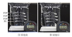 导管的弯曲实验结果表明,FEP导管在37 ℃的蒸馏水中浸泡10 min后,形变量几乎没有任何变化,而PU导管在升温后在重物的重力作用下发生了明显弯曲,如图6所示。弯折回复实验结果显示,PU导管去掉重物5 min后,基本得到复原,而FEP导管则保持弯折状态。该结果说明PU导管的弯折回复性能优于FEP导管。临床上可能会出现导管弯折的情况,如不能迅速回复原来的状态,则意味着液流通路被阻塞或者流量降低,从而达不到给药的要求。导管的弯曲实验与弯折回复实验结果进一步说明PU导管在体温条件下优于FEP导管。