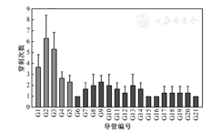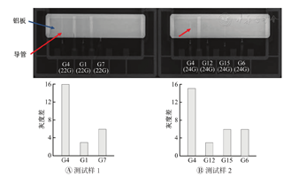 对X射线扫描得到图像进行处理,通过铝板和导管灰度的差值来体现不同留置针导管的X射线可探测性。图9所示为测试样1和测试样2的测试结果,每个测试样上都固定了若干导管。图9中上标明了留置针导管的编号,括号中为留置针导管的尺寸型号。结果显示,导管的材质并不会对其X射线可探测性产生明显影响,从X射线扫描图像上观察不出PU导管和FEP导管间有明显的差异,其X射线可探测性更多地与厂商选择的硫酸钡显影条有关。