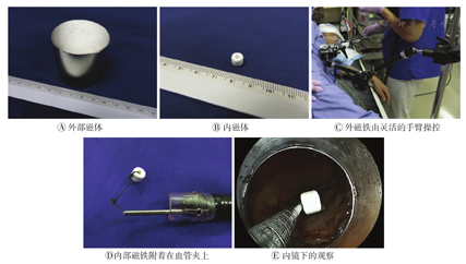 近几年,国内磁锚定与内镜的结合使用也得到了广泛发展。2019年,华西医院使用磁珠辅助下内镜黏膜下剥离术(magnetic beads-as-sisted endoscopic submucosal dissection, MBA-ESD)对1例异位十二指肠胃粘膜纤维化的患者进行治疗,病变被整块平滑剥离,患者术后第5天出院,且伤口在一个月后已经愈合,这表明MBA-ESD是安全、有效且高效的;但磁铁主要通过重力发挥作用,只有在相同位置添加额外的磁珠时,磁力才发挥作用[28]。同年,西安交大一附院的刘豪等[29]针对ESD术中黏膜创面暴露难题设计了基于磁锚定技术的磁性水凝胶辅助ESD手术方案。通过磁性水凝胶黏膜注射,同时给予体外锚定磁体牵引,以实现黏膜切除中创面的充分暴露。内磁体转为液态,占用空间更少,适合在食道等狭窄部位进行的手术操作。