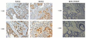 免疫组化结果表明,KIFC1在TNBC组织中的高表达率为58.3%(56例/96例),低表达率为41.7%(40例/96例),而KIFC1在癌旁正常组织中主要是低表达或无表达(图3)。进一步分析KIFC1的表达与TNBC的临床病理特征的关系。结果显示,KIFC1在TNBC组织中的表达与肿瘤分级相关(P=0.016),且高表达KIFC1者有发生远处转移的趋势。但是KIFC1高表达和低表达者在年龄、肿瘤大小、淋巴结转移等方面的差异无统计学意义(均P>0.05),见表1。