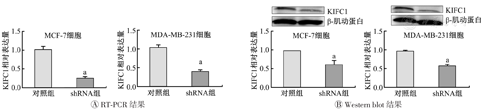 RT-PCR—逆转录定量聚合酶链反应;KIFC1—驱动蛋白家族成员C1;对照组为未敲低KIFC1的MCF-7和MDA-MB-231;细胞;shRNA组为敲低KIFC1的MCF-7和MDA-MB-231;与对照组比较,aP<0.05
