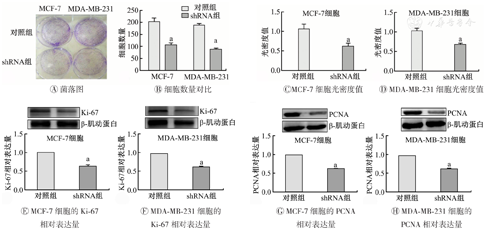 KIFC1—驱动蛋白家族成员C1;PCNA—增殖细胞核抗原;对照组为未敲低KIFC1的MCF-7和MDA-MB-231;shRNA组为敲低KIFC1的MCF-7和MDA-MB-231细胞;与对照组比较,aP<0.05