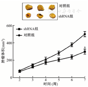 裸鼠的养育和操作经过了天津医科大学第二医院动物伦理委员会的批准。将4周龄的雌性无胸腺BALB/c小鼠分为两组,分别在小鼠右侧皮下注射上述细胞培养中成功建立的两种稳定MDA-MB-231细胞系(KIFC1抑制组和对照组)。注射2周后,每7天测量肿瘤尺寸;注射7周后处死小鼠,分离肿瘤组织并拍照。