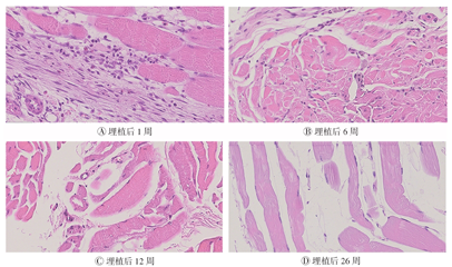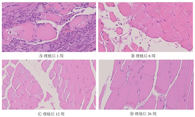 CB埋植后当天动物饮水和进食均正常,无感染。动物肌肉组织的苏木精-伊红染色结果显示,埋植后1周,靠近材料处的肌肉间质有炎症反应,可见淋巴细胞、较多异物巨细胞和炎症细胞浸润,肌肉纤维水肿增粗;埋植后6周,肌肉间质可见较多淋巴细胞,肌肉纤维恢复正常;埋植后12周,肌肉间质可见少量异物巨细胞和淋巴细胞;埋植后26周,肌肉间质未见淋巴细胞和异物巨细胞,靠近材料处的肌肉纤维与正常肌肉纤维无差异(图2)。