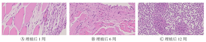 阳性对照组医用硅橡胶材料埋植后10周起动物开始出现感染死亡,表现为肌肉溃烂、流脓。动物肌肉组织的苏木精-伊红染色染色结果显示,靠近材料处的肌肉间质始终存在大量的炎症细胞浸润,且随着时间的推移炎症细胞呈弥漫性浸润,炎症细胞数量增加(图3)。